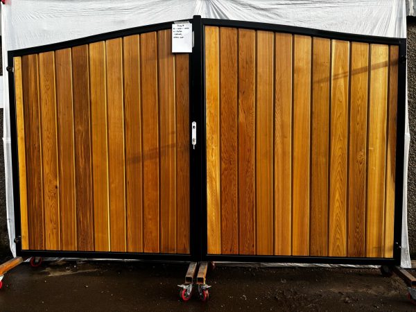 Western red cedar ex showroom driveway gates. Metal framed timber.